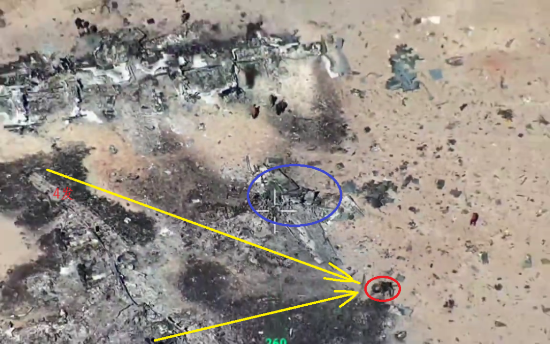 从1发向后看去,红圈处是前架,蓝圈处是机尾破败(尾锥+平尾+垂尾)。