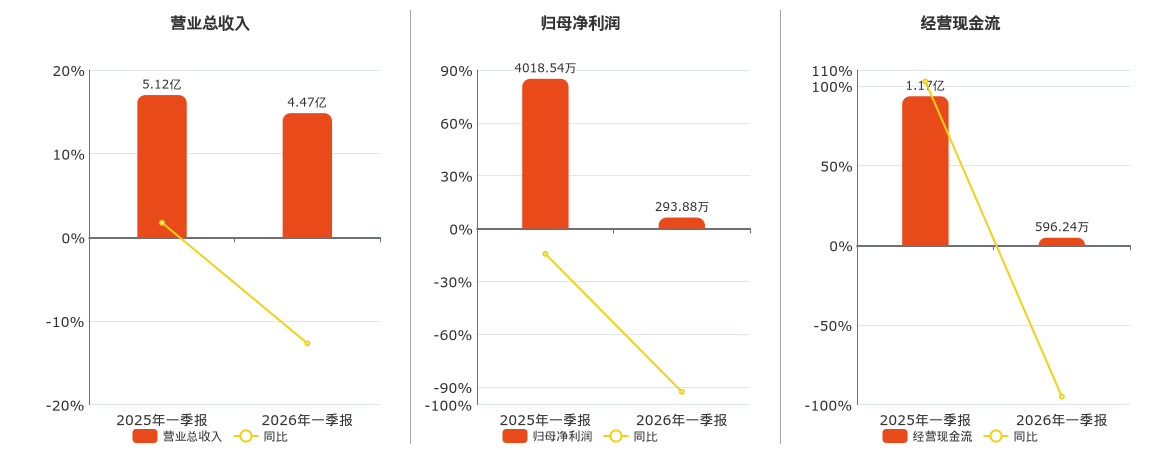公司贸易总收入为4.47亿元,较前年同陈说期贸易总收入减少6497.00万元,同比拟前年同时下落12.68%。归母净利润为293.88万元,较前年同陈说期归母净利润减少3724.66万元,同比拟前年同时下落92.69%。指标举止现款净流入为596.24万元,较前年同陈说期指标举止现款净流入减少1.11亿元,同比拟前年同时下落94.92%。