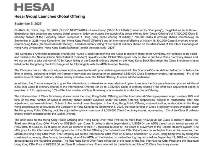 据禾赛科技官网线路,日前通过港股上市聆讯的禾赛科技负责启动众人刊行筹划,香港公建立售将于9月8日运行。具体来看,禾赛集团启动1700万股B类股份的众人发售。香港发售价钱最高为每股228.00港元或29.04好意思元,同期,公司B类夙昔股将在港交所主板扫尾双重主要上市,股票代码为“2525”。