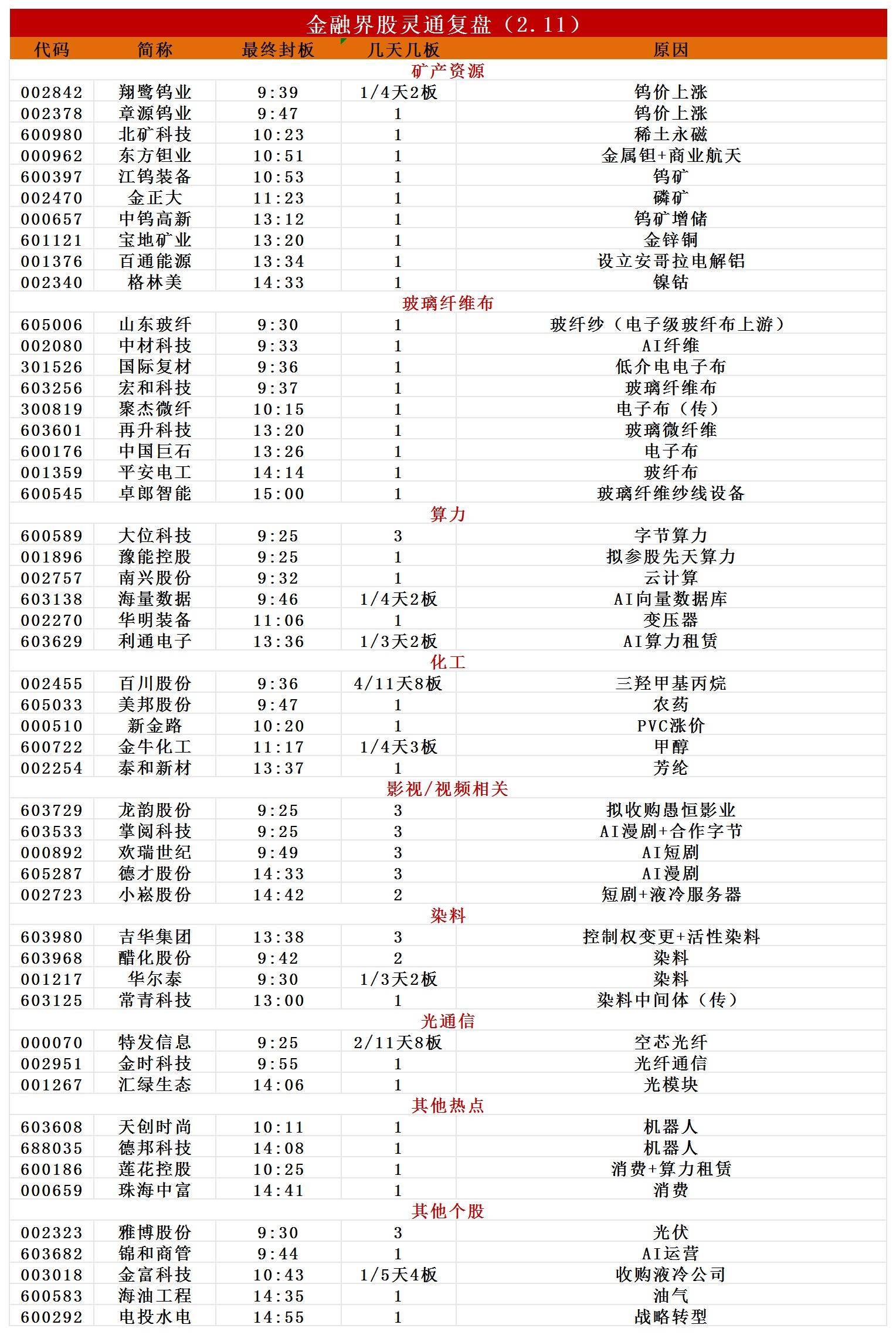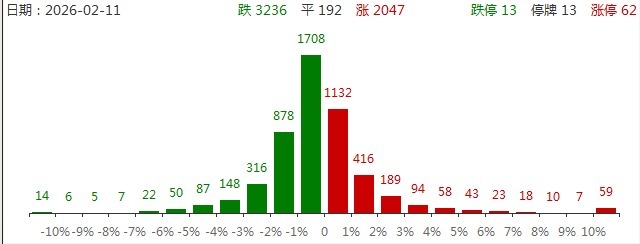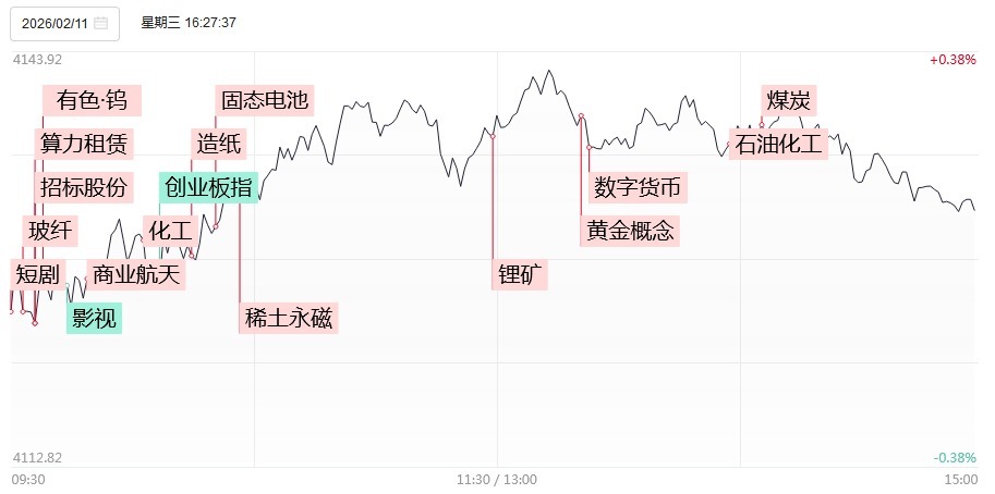 2月11日,三大指数涨跌不一,创业板指、科创50指数跌超1%。截止收盘,沪指涨0.09%,深成指跌0.35%,创业板指跌1.08%。时隔31个交游日,沪深两市成交额跌破2万亿,较上一个交游日缩量1213亿。盘面上,全商场超3200只个股着落,共62只股涨停。从板块来看,化工板块近期反复走强,吉华集团5天4板,泰和新材、百川股份、醋化股份、华尔泰涨停。玻纤主见快速拉升,宏和科技、山东玻纤、海外复材、中国巨石涨停。有色金属板块进展活跃,有色·钨主见领涨,翔鹭钨业4天2板,章源钨业涨停。算力租借主见拉升,南兴股份、大位科技涨停。着落方面,影视院线主见集体下挫,横店影视跌停,华谊昆季、华策影视、中国电影大跌。